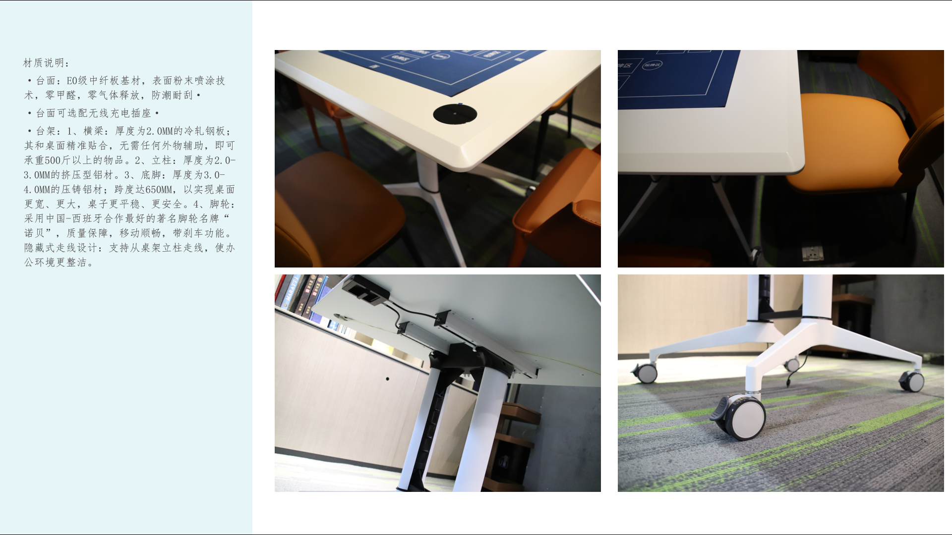 臺(tái)架:1、橫梁:厚度為2.0MM的冷軋鋼板;其和桌面精準(zhǔn)貼合,無需任何外物輔助,即可承重500斤以上的物品。2、立柱:厚度為2.0-3.0MM的擠壓型鋁材。3、底腳:厚度為3.0-4.0MM的壓鑄鋁材;跨度達(dá)650MM,以實(shí)現(xiàn)桌面更寬、更大,桌子更平穩(wěn)、更安全。4、腳輪:采用中國(guó)-西班牙合作最好的著名腳輪名牌“諾貝”,質(zhì)量保障,移動(dòng)順暢,帶剎車功能。隱藏式走線設(shè)計(jì):支持從桌架立柱走線,使辦公環(huán)境更整潔。